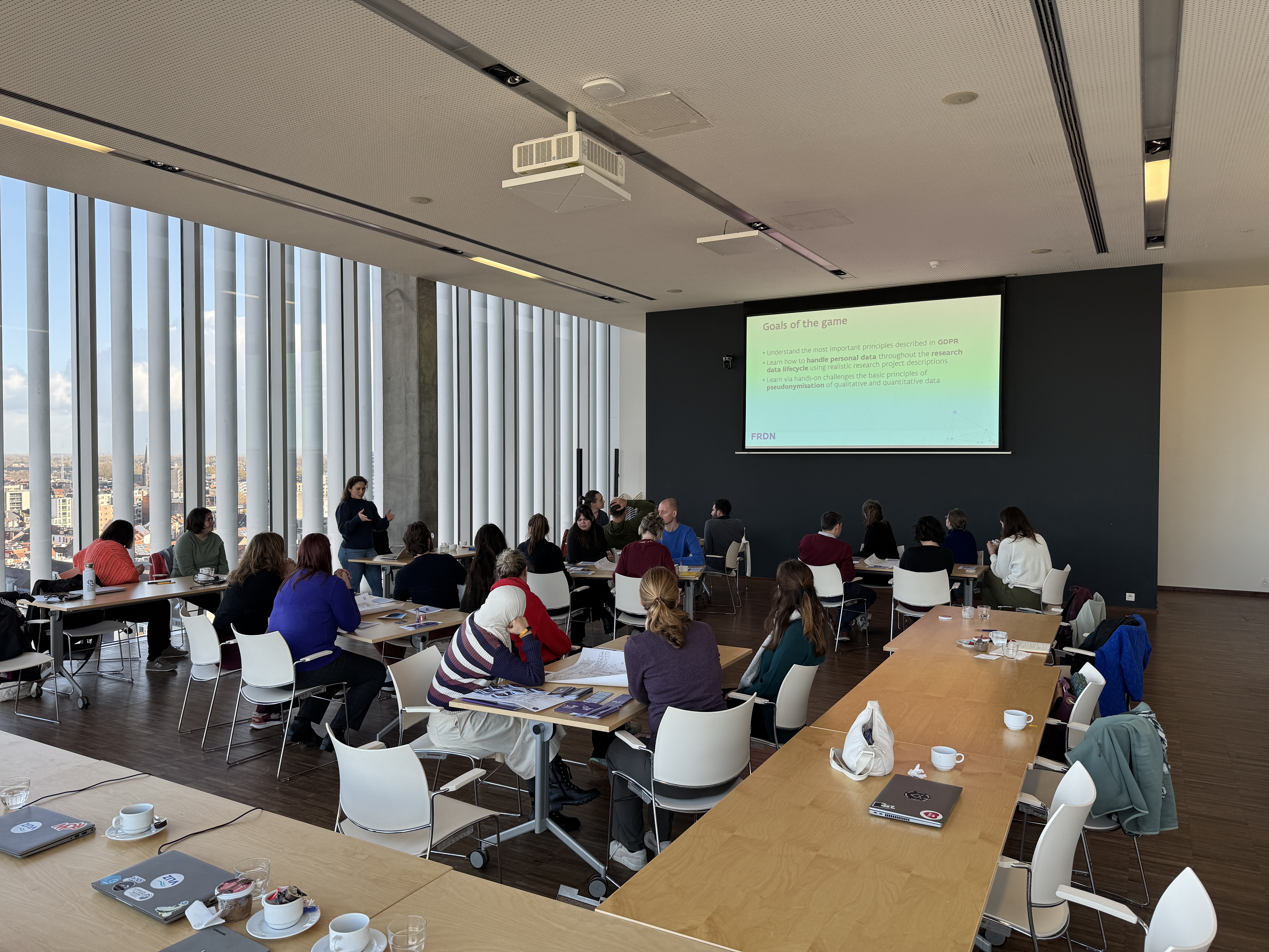 After a tasty lunch, we wrapped up the academic part of the day and shifted the focus to the community itself, starting with an update on our latest KH Project Group ‘FRDN game’. This project group was launched shortly after the Community Day in Leuven in September 2024. Inspired by the fun and learning value of existing educational games in the field of research data management, a small team of four set themselves the challenge of creating our own game—focused specifically on the topic of GDPR and handling personal data.
